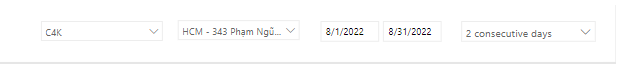 Ví dụ: Người dùng muốn lọc danh sách các học viên học khóa C4K tại cơ sở 343 Phạm Ngũ Lão nghỉ 2 học buổi liên tiếp, từ ngày 1/8/2022-31/8/2022 thì bộ lọc sẽ được chỉnh như sau: