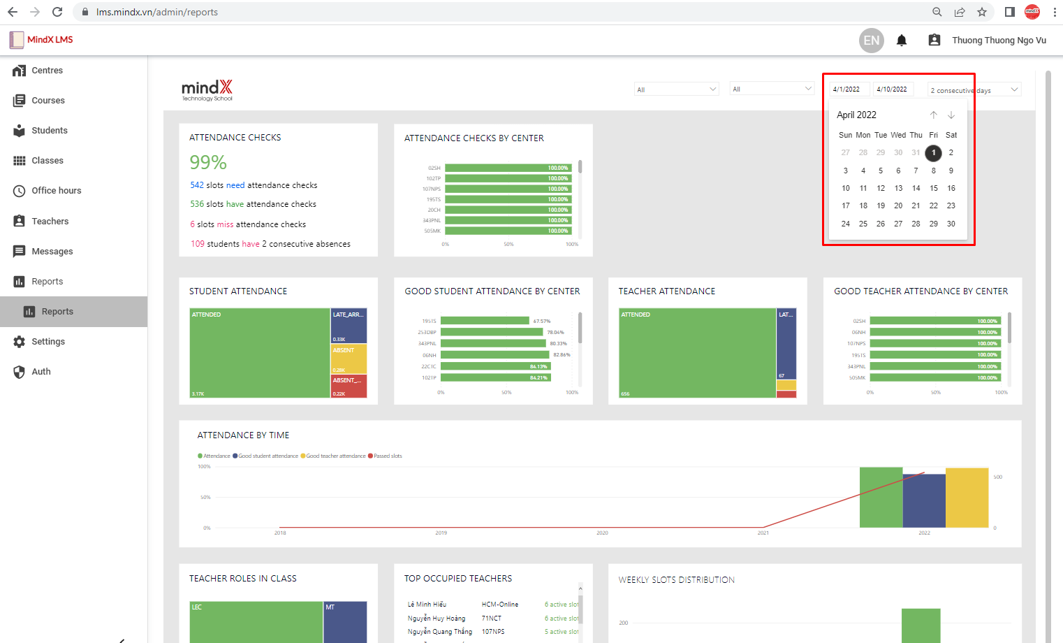 Trong ảnh trên, Attendance checks by center thể hiện cơ sở 02SH đang có 100% lớp hoàn thành điểm danh (trên tổng số các lớp đang hoạt động của cơ sở), tương tự như vậy với các cơ sở khác.Các cơ sở trong bảng này sẽ được sắp xếp theo tỷ lệ từ thấp tới cao: các cơ sở có tỷ lệ hoàn thành điểm danh cao nhất được xếp bên trên, càng xuống dưới cơ sở càng có tỉ lệ hoàn thành điểm danh thấp.